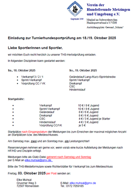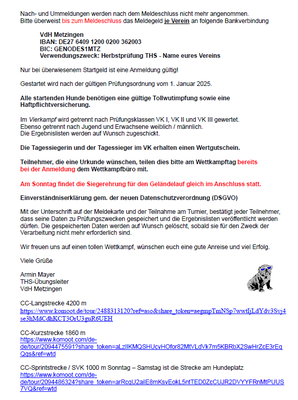 Wir wünschen allen Startern viel Erfolg und vor Allem viel Spaß. Ihr habt alle bereits bewiesen, dass Ihr in der Lage seid, auch unter Druck gemeinsam mit Euren vierbeinigen Partnern Höchstleistungen abzuliefern. Die Teilnahme an der Deutschen Meisterschaft ist der Lohn dafür.
