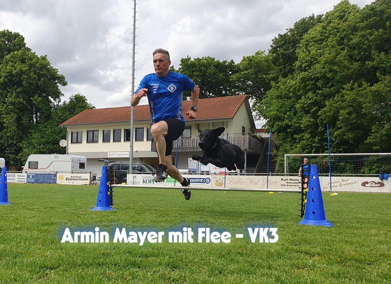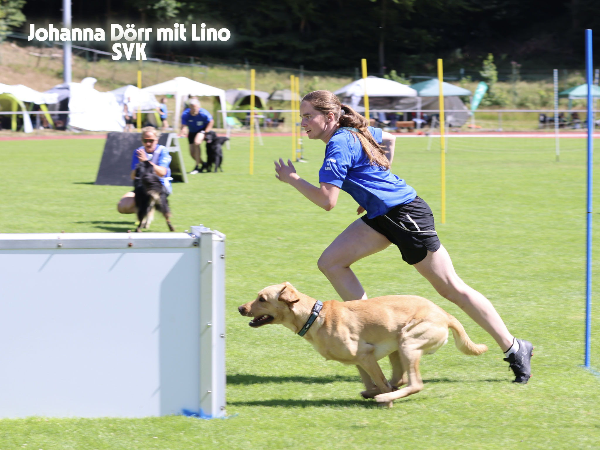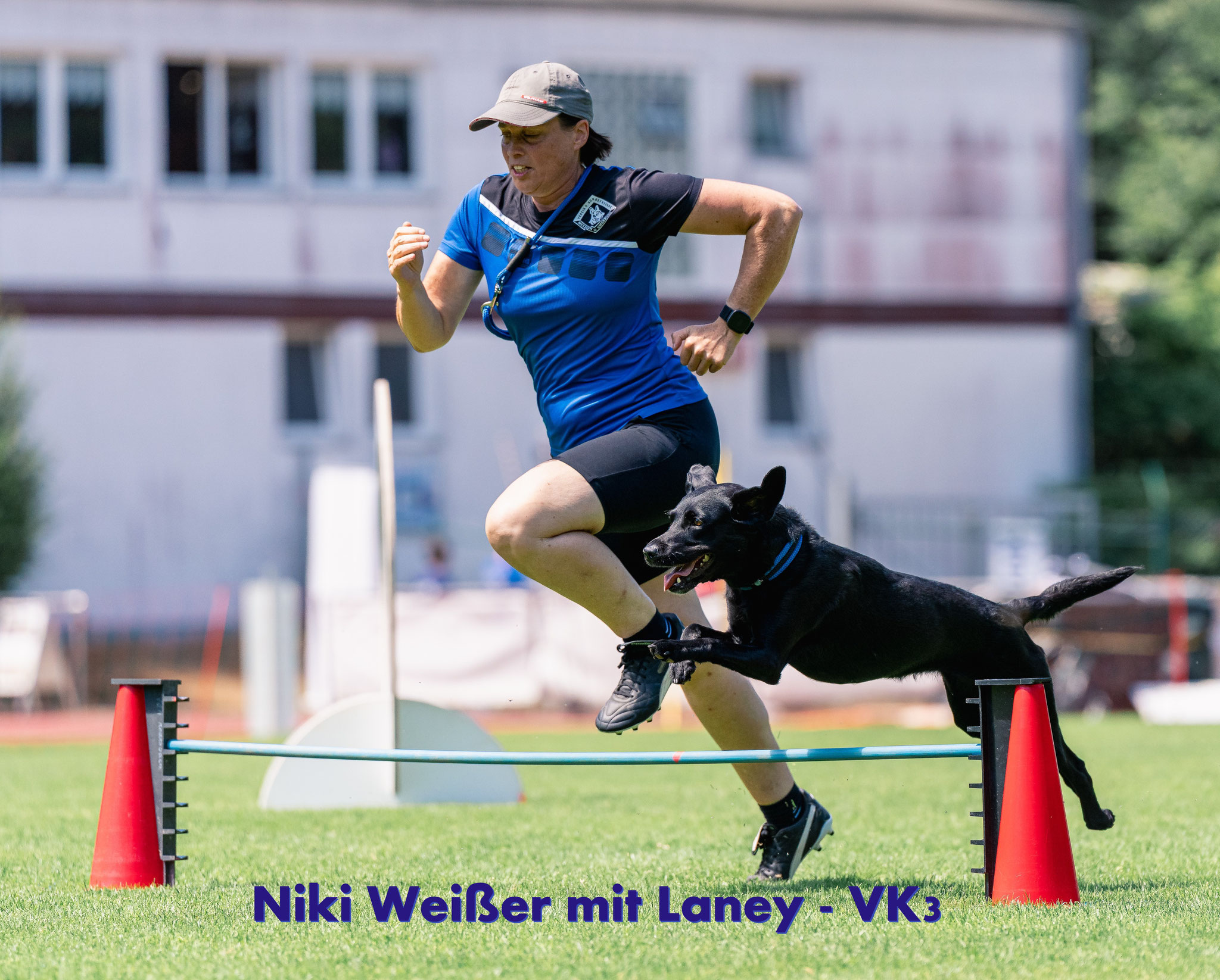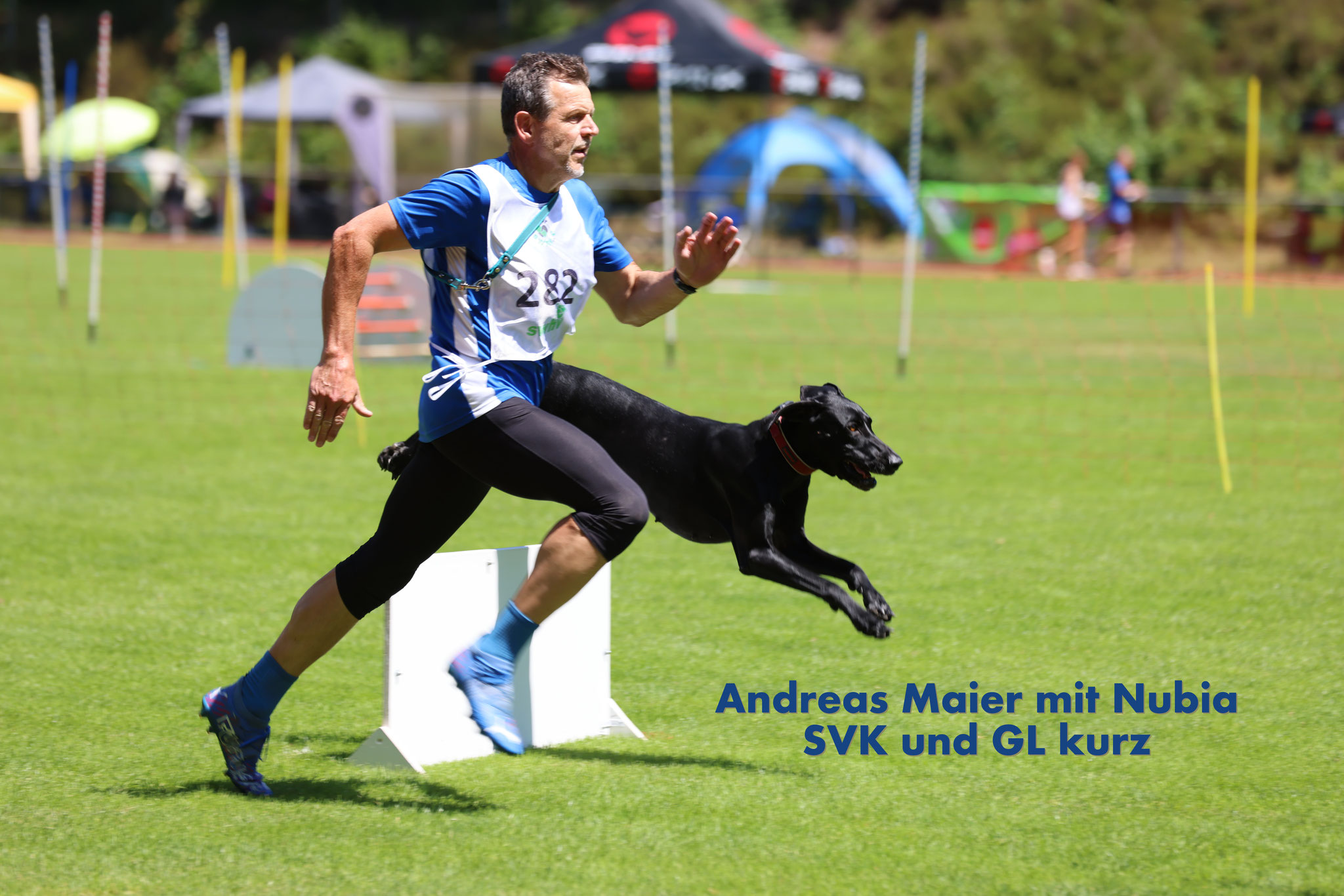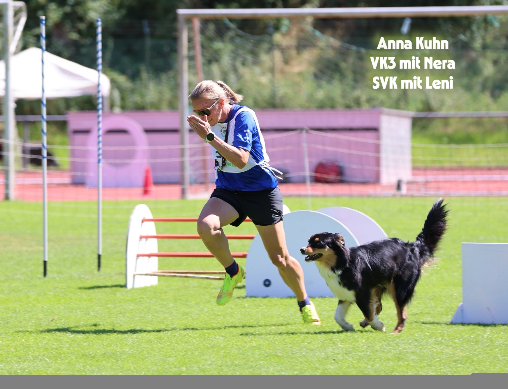 Ab der Mittagszeit schnürten dann Unsere Vierkämpfer die Kickschuhe, um bei den Laufdisziplinen noch die ein- oder andere Sekunde aufzuholen. Tatsächlich konnten alle Vierkämpfer hier fehlerfreie und schnelle Läufe zeigen und ihre Platzierungen nach der Unterordnung verbessern. Armin Mayer hatte wie immer die Siebenmeilenstiefel an, erkämpfte sich mit Flee dadurch Platz 2 und wurde Deutscher Vizemeister (51,5/278,26). Alisa Lutz erreichte mit Eila Platz 12 (49/270,18). Elke Muhsal landete am Ende auf Platz 7 (45/267,19). Anna Kuhn und Leni erreichten ebenfalls den 7. Platz (47/268,86). Niki Weißer musste mit Laney nach 55,5 Punkten in der Unterordnung leider verletzt aufgeben.