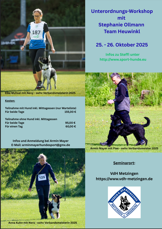 Die Unterordnungen für den Vierkampf begannen recht früh, was den meisten von uns ganz recht war, so mussten wir unsere Nervosität nicht zu lange ertragen. Die Vorführungen der Metzinger Sportler fielen recht unterschiedlich aus, von positiven Überraschungen bis hin zu bitterer Enttäuschung war leider alles dabei. Es ist aber auch wirklich schwierig für Hund und Mensch, auf 4 Ringen zu laufen, mit wenig Abstand zu Zuschauern und Nachbarring. Deswegen kann jeder absolut stolz auf sich sein, denn blamiert hat sich gewiss niemand.